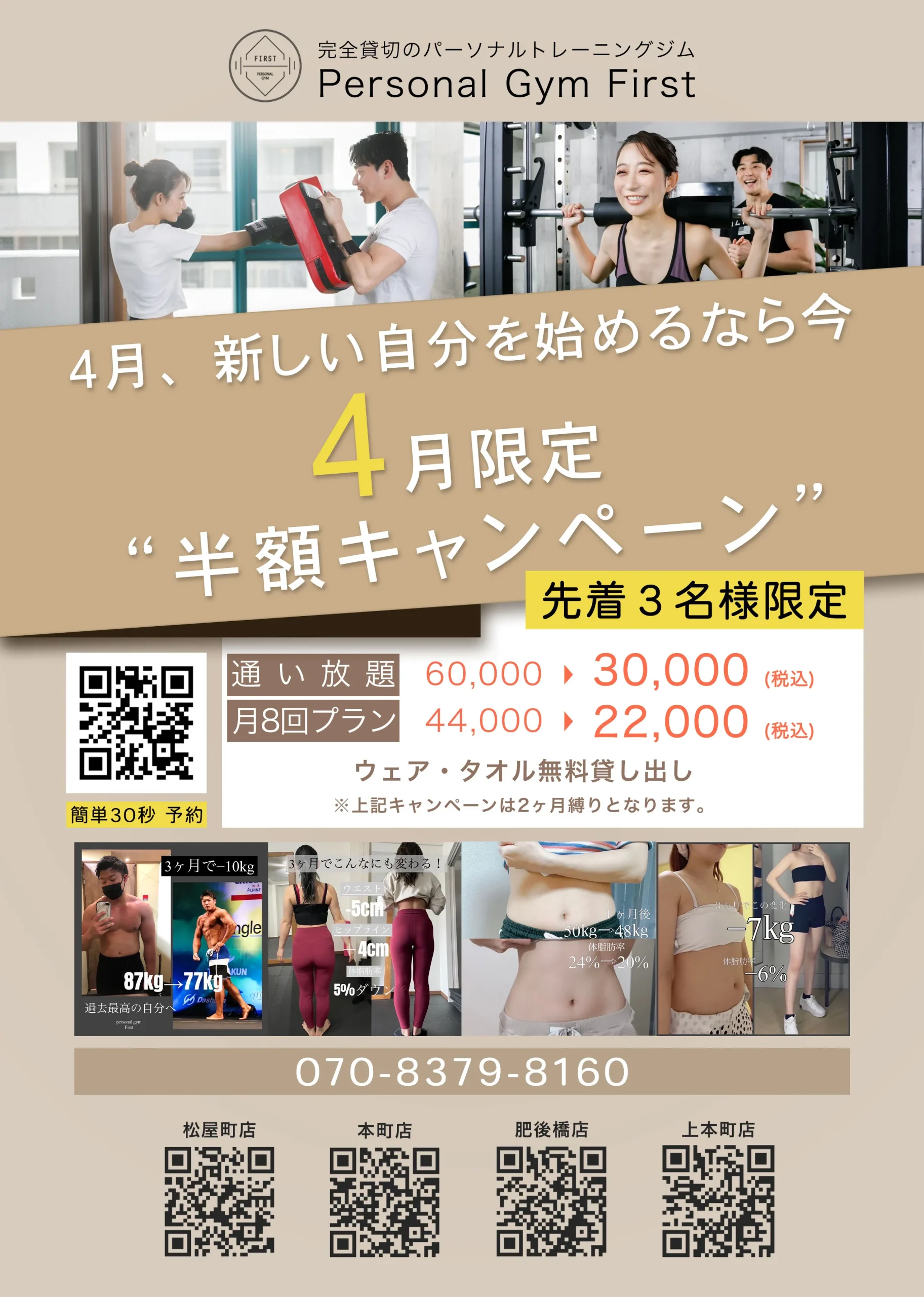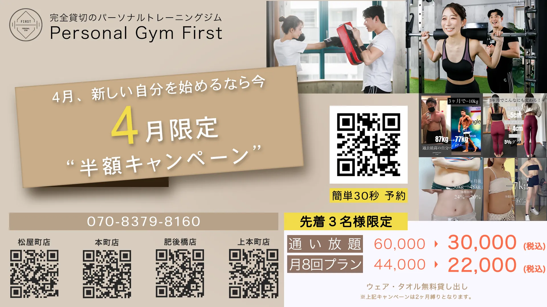 体験トレーニング通常6,600円税込みが今だけ0円!|入会金通常20,000円税込みが今だけ0円!|さらに半額キャンペーンも実施中!|通い放題プラン60,000円→30,000円(税込)月8回プラン44,000円→22,000円(税込)※上記キャンペーンは2か月縛りとなります。先着3名様限定 体験トレーニング通常6,600円税込みが今だけ0円!|入会金通常20,000円税込みが今だけ0円!|さらに半額キャンペーンも実施中!|通い放題プラン60,000円→30,000円(税込)月8回プラン44,000円→22,000円(税込)※上記キャンペーンは2か月縛りとなります。先着3名様限定